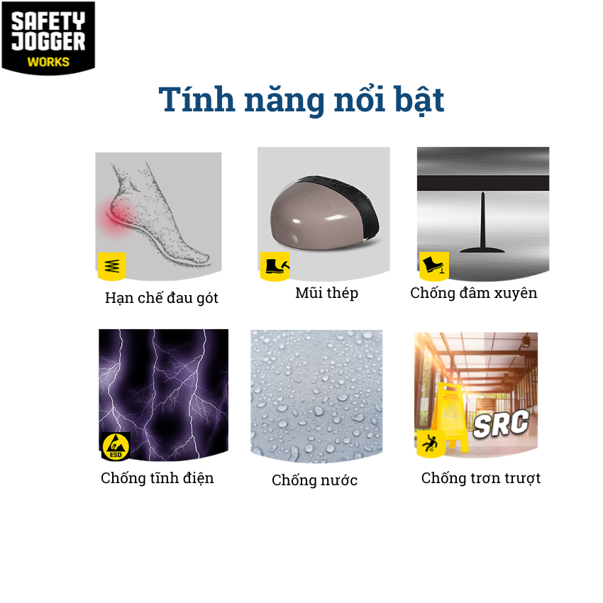 – Dầu, hóa chất, chống dập ngón, chống đâm xuyên, chống tĩnh điện, chống trượt, chống nước, đế giảm sốc